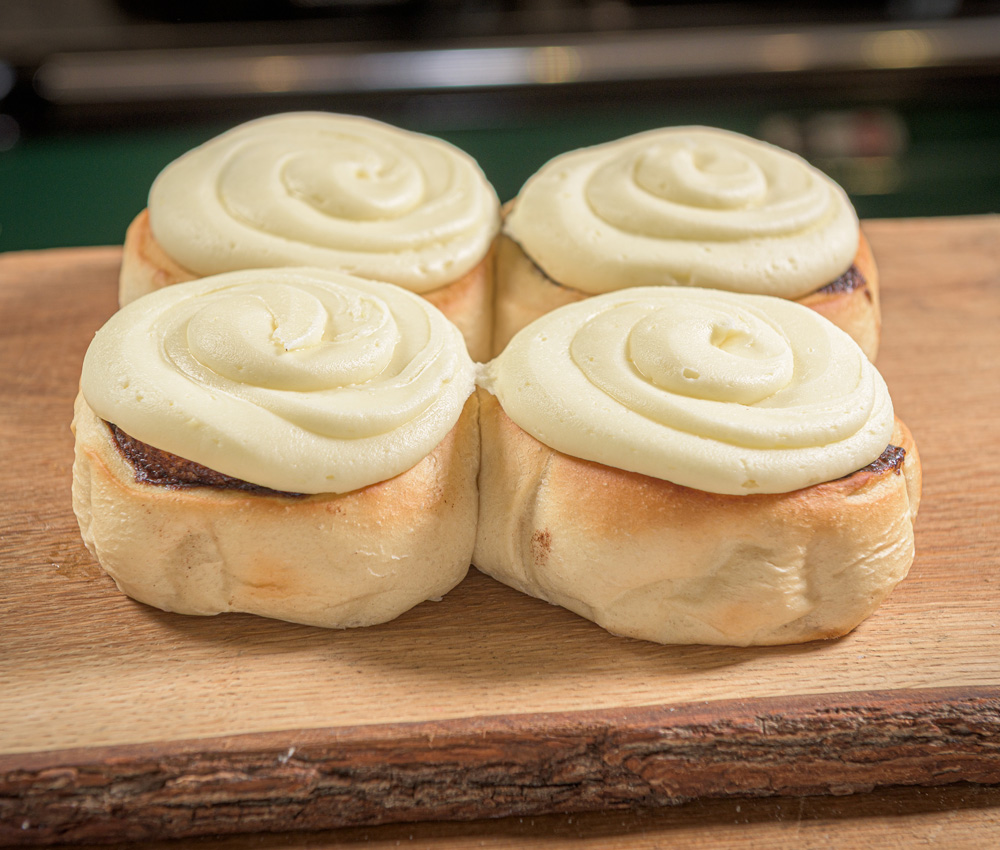 Enjoy each bite of our award-winning cinnamon buns, layered with buttery cinnamon filling and lavishly topped with smooth cream cheese frosting.