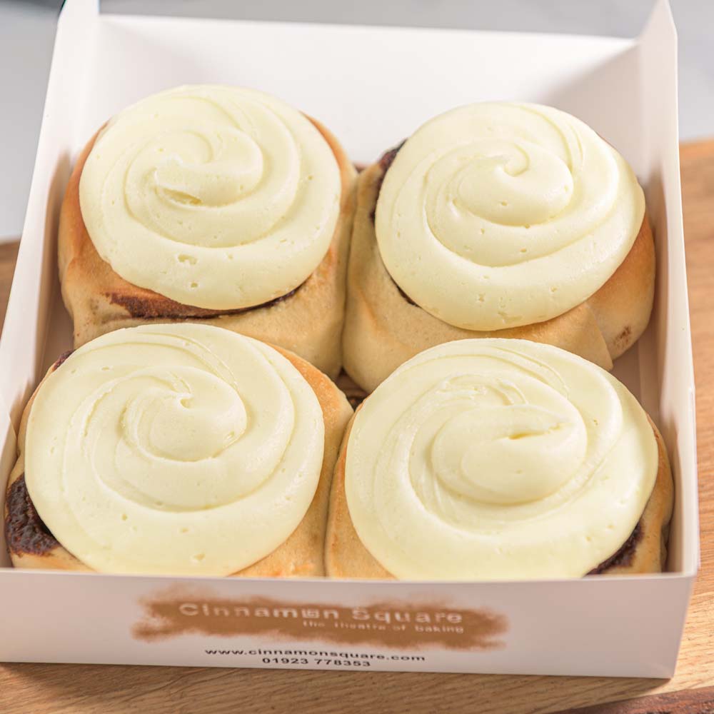 Cinnamon Buns Box of 4 large features our original multi award-winning Cinnamon Bun, a firm favourite with Cin’ners and world food experts, winner of a Great Taste Gold Award and a Quality Food & Drink Award. Each bun is deliciously soft and gooey, layered with a buttery cinnamon filling and lavishly topped with cream cheese frosting. Serve warmed for a full, mind-blowing Cinnamon Square Bun experience – no wonder it’s probably the best ever Cinnamon Bun.