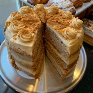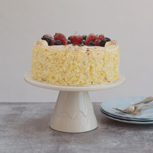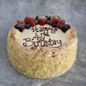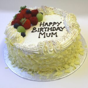 Layers of light vanilla sponge, filled with fresh whipped cream and seasonal fruits. Finished with white chocolate shavings around the outside, a decorative piping of fresh whipped cream and a selection of seasonal fruits.