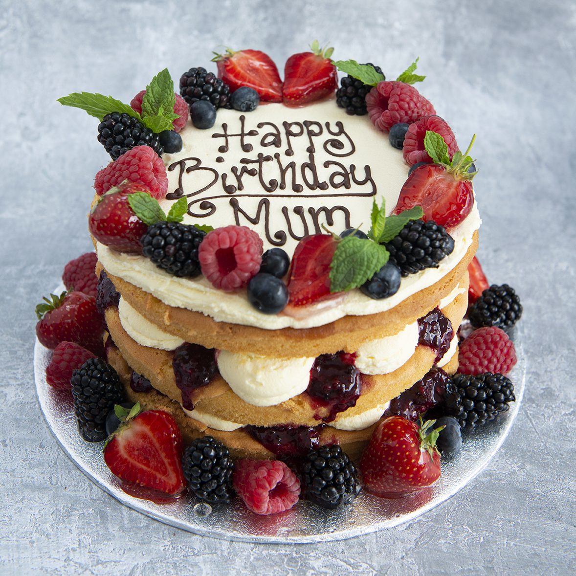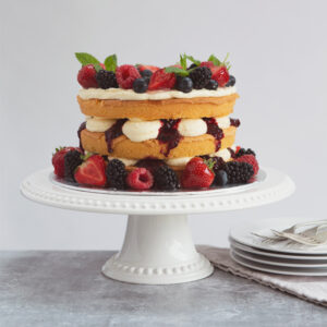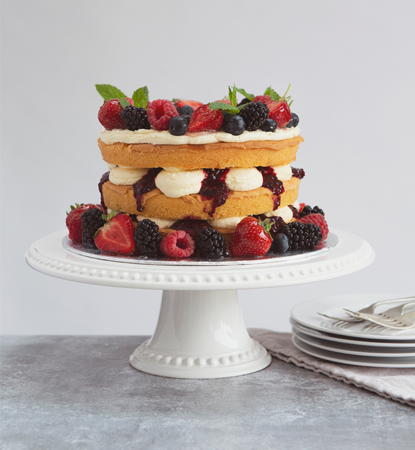 Our twist on the classic Victoria Sponge features three layers of vanilla sponge filled with vanilla buttercream and our homemade berry compote, and is topped with a selection of fresh berries.